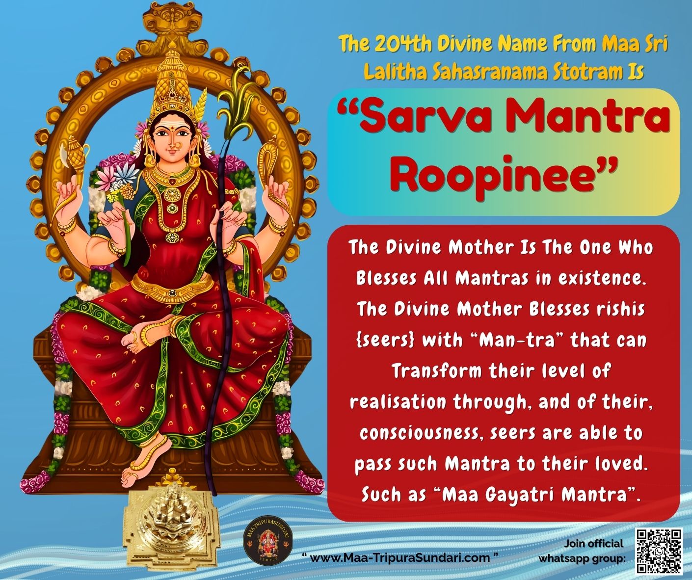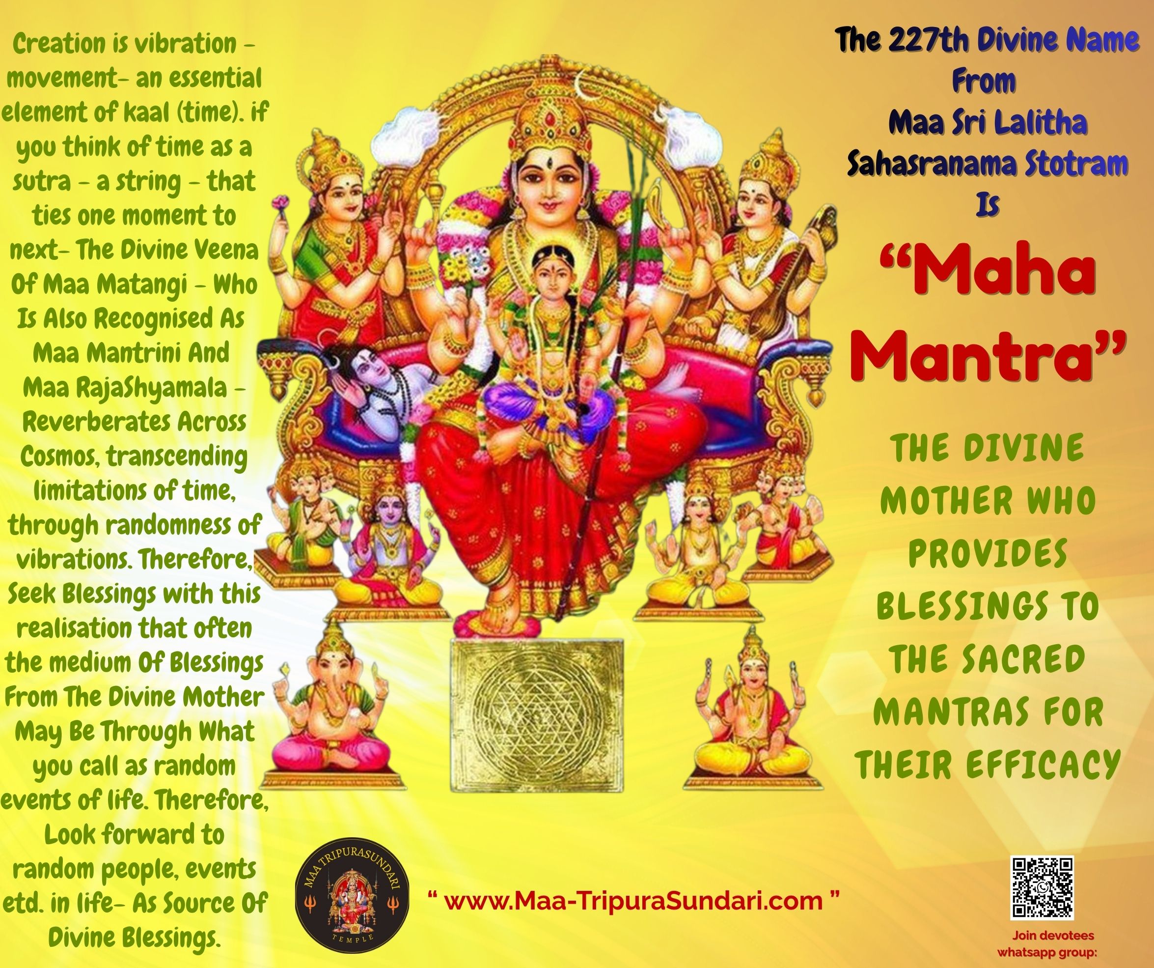 The 227th Divine Name FromMaa Sri Lalitha Sahasranama Stotram Is“Maha Mantra” THE DIVINE MOTHER WHO PROVIDES BLESSINGS TO THE SACRED MANTRAS FOR THEIR EFFICACY Creation
