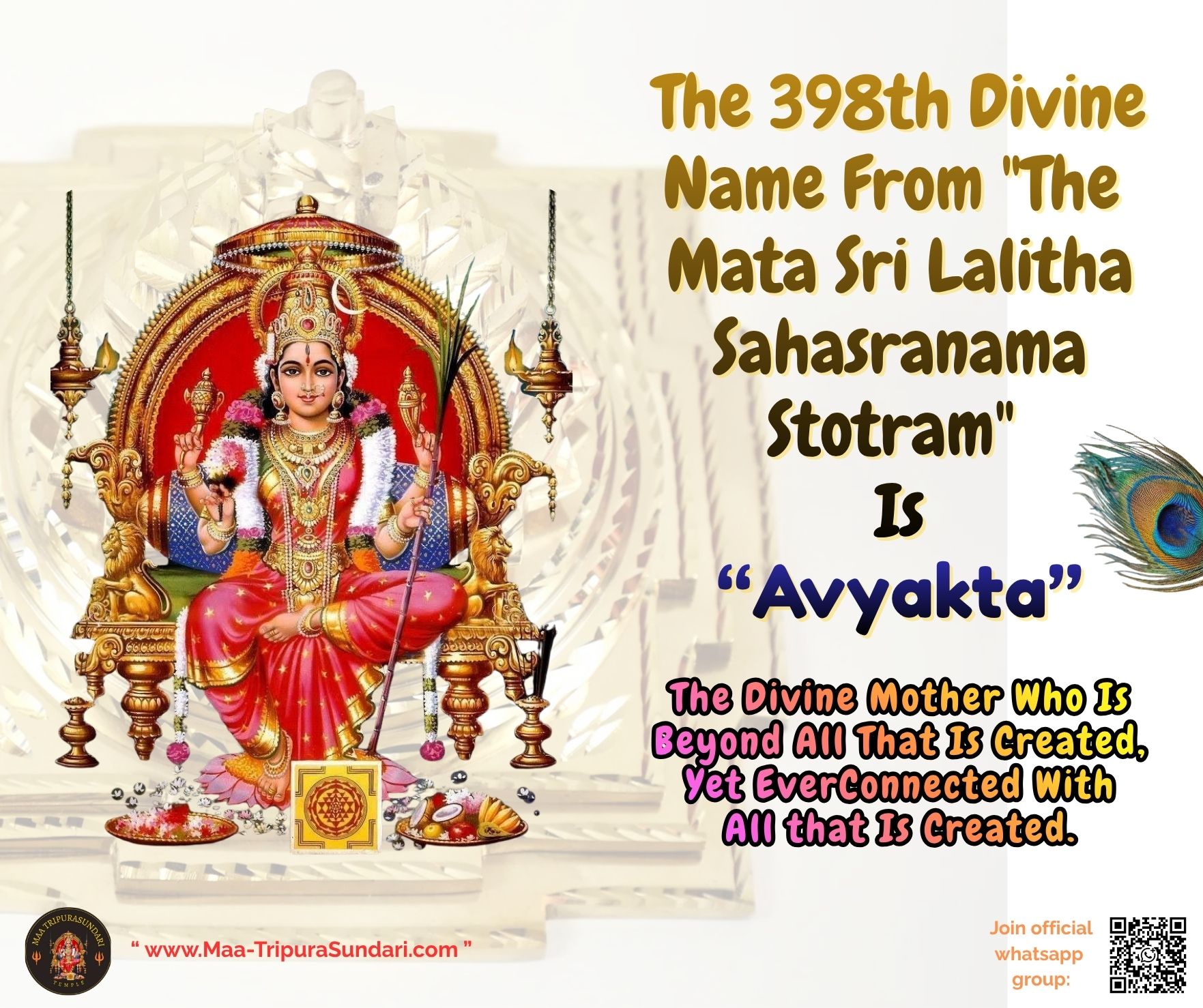 The 398th Divine Name From “The Mata Sri Lalitha Sahasranama Stotram” Is “Avyakta” The Divine Mother Who IsBeyond All That Is Created,Yet EverConnected WithAll that