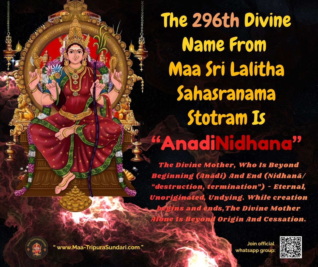 The 296th Divine Name From Maa Sri Lalitha Sahasranama Stotram Is “AnadiNidhana” The Divine Mother, Who Is Beyond Beginning (Anādi) And End (Nidhanā/ “destruction, termination”)