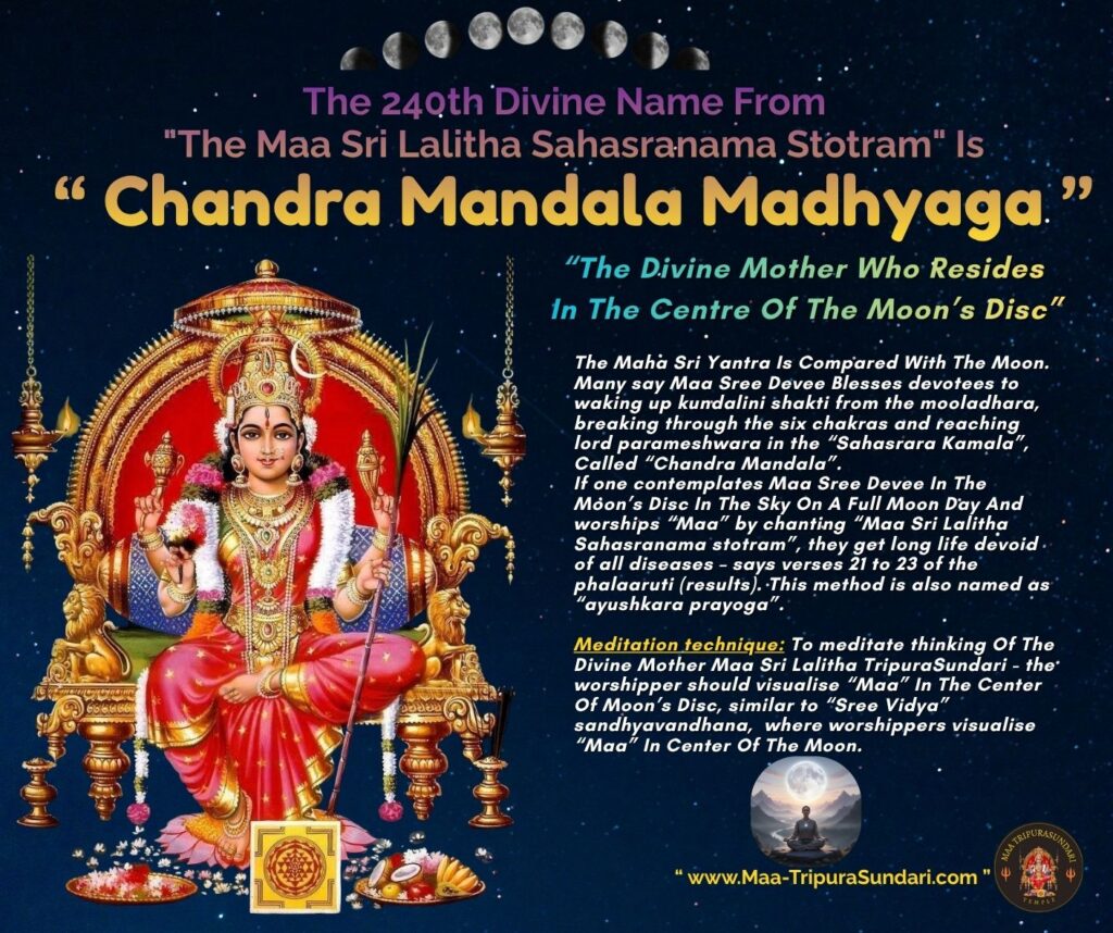 Meditation technique: To meditate thinking Of The Divine Mother Maa Sri Lalitha TripuraSundari – the worshipper should visualise “Maa” In The Center Of Moon’s Disc, similar to “Sree Vidya” sandhyavandhana, where worshippers visualise “Maa” In Center Of The Moon.