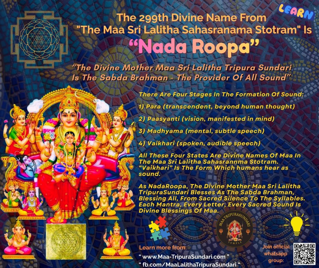 As NadaRoopa, The Divine Mother Maa Sri Lalitha TripuraSundari Blesses As The Sabda Brahman, Blessing All, From Sacred Silence To The Syllables. Each Mantra, Every Letter, Every Sacred Sound Is Divine Blessings Of Maa.